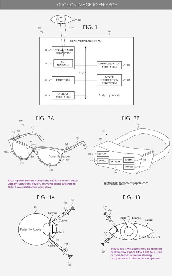 蘋果專利圖 1 顯示了眼動追蹤設備的示例框圖;圖 3A 示出了眼動追蹤設備的第一個示例,其中光學傳感子系統和處理器被安裝到一副眼鏡上;圖 3B 示出了眼動追蹤設備的第二個示例,其中光學傳感子系統和處理器被安裝到 VR 頭顯上;圖 4A 顯示了一組 SMI 傳感器示例的側視圖,這些傳感器可以安裝在頭戴式框架上,并配置為向眼睛發射光線;圖 4B 示出了圖 4A 所示的眼睛和 SMI 傳感器組的前視圖。