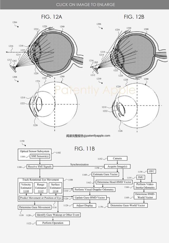 蘋果專利圖 11B 示出了追蹤眼球運動的示例方法,該方法使用一組或多個 SMI 傳感器與攝像頭或其它傳感器組合。