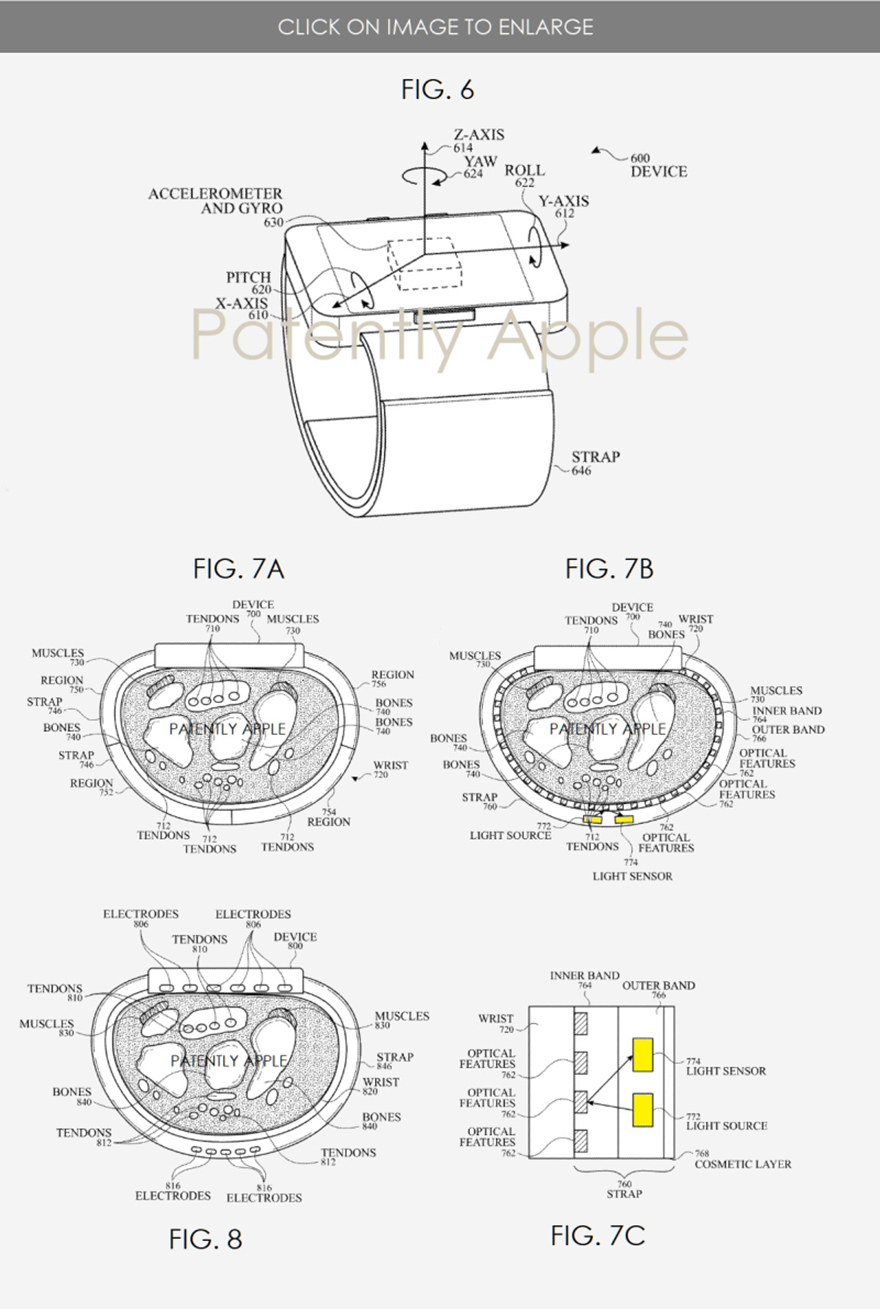 這項(xiàng)被披露的專(zhuān)利技術(shù)中顯示,當(dāng)用戶佩戴手表的時(shí)候,可以通過(guò)手腕的揮動(dòng)與旋轉(zhuǎn)的操作來(lái)操作手表。同時(shí)使用一個(gè)或者多個(gè)慣性傳感器與肌膚觸摸電傳感器來(lái)檢測(cè)用戶的身體運(yùn)動(dòng)。